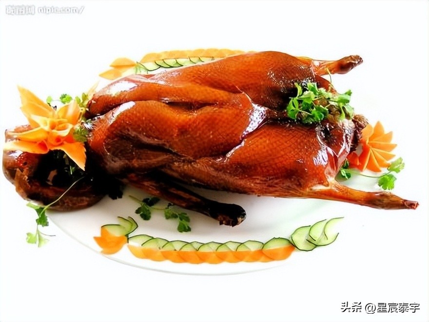 北京烤鸭,具有世界声誉的北京名菜,起源于南北朝时期,《食珍录》中已有记录,时属宫廷名菜。用料为优质肉食鸭,果木炭火烤制,色泽红润,肉质肥而不腻,外脆里嫩。