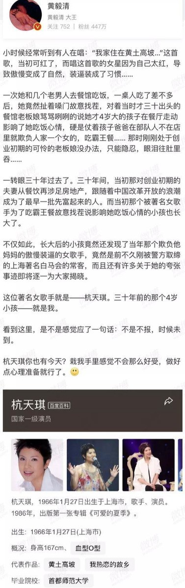 对于为什么要选择在这个时间爆出这些料,黄毅清也大方回应:自己是为了当时还没有发家的父母受到的欺负讨个公道。为什么是现在?因为直到现在杭天琪才被抓住去白马会的把柄。