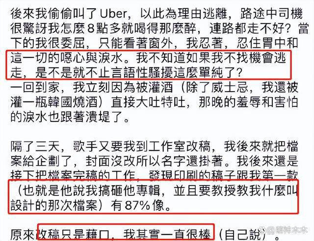 后来自己找了借口临时逃脱,在醉酒的出租车上委屈加倍,忍住泪水和恶心,不然事情不止言语骚扰这么简单。被骚扰三天后,对方又以改稿名义找设计师,她之后便把文案给了企划,并完成了后续工作。当看到印刷品的时候,发现跟第一版设计有 87% 的相似性,才知道一切都是借口。