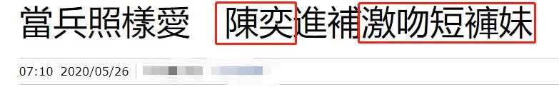 陈奕虽然在今年2月份入伍,但期间依旧会助力公益,拍摄短片,曝光度依旧不输从前,谈恋爱也没落下,5月26日,港媒爆料陈奕又有新恋情,其被拍到与一名神秘女当街拥吻。
