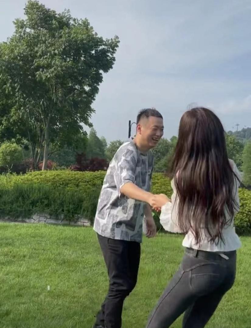 画面中,药水哥和女友两人在草地上嬉戏打闹。药水哥紧紧牵着女友的手转圈,笑得合不拢嘴,画面浪漫得像是在拍偶像剧一般。
