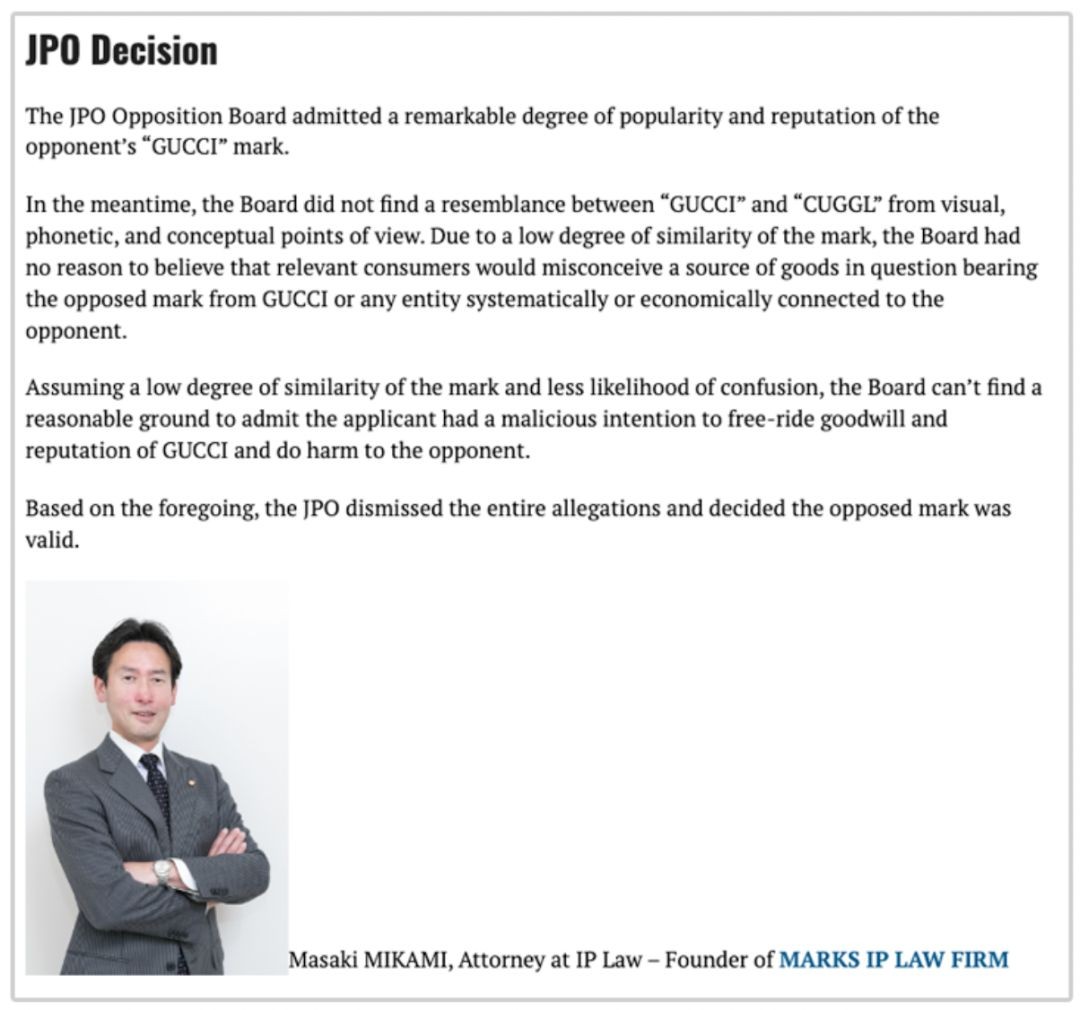 然而,日本商标局认为虽然GUCCI具有较高的知名度,但从视觉、语音和含义上,并没有发现二者的相似之处,不会造成消费者混淆,并据此驳回了GUCCI针对的商标异议请求。