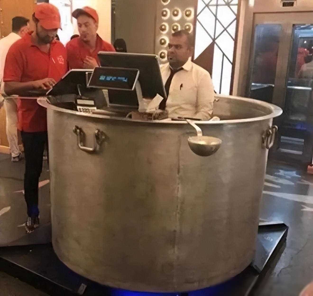 这个服务台的设计真是太有创意了,仿佛是一个巨大的火锅盛宴。
