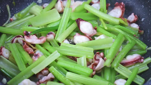 6 把鱿鱼脚炒香之后,加入芹菜段,接着翻炒均匀。