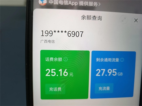 那么进入这个界面之后,系统会自动查询话费余额和流量余额,并在页面上显示相关信息,我们就可以看到自己的话费余额是剩余25.16元,以及流量余额剩余27.95GB,