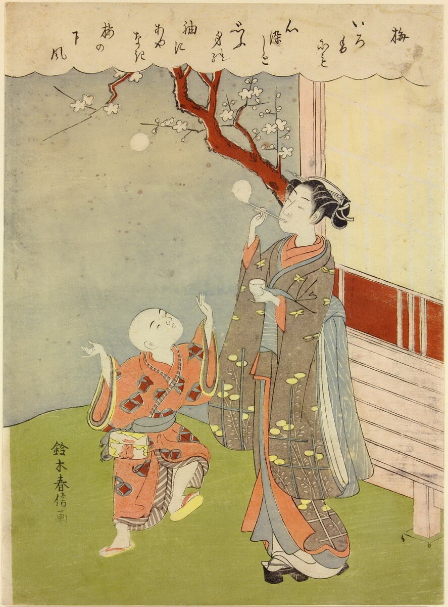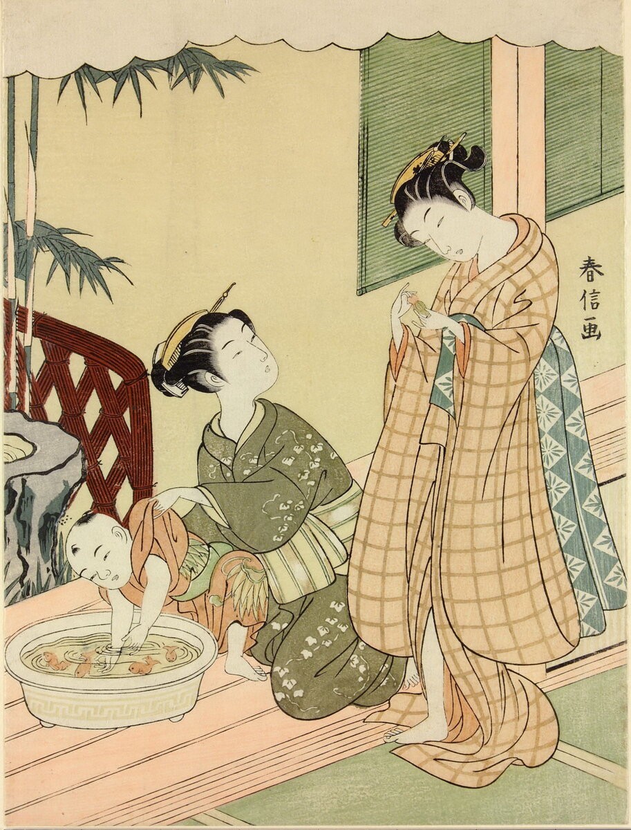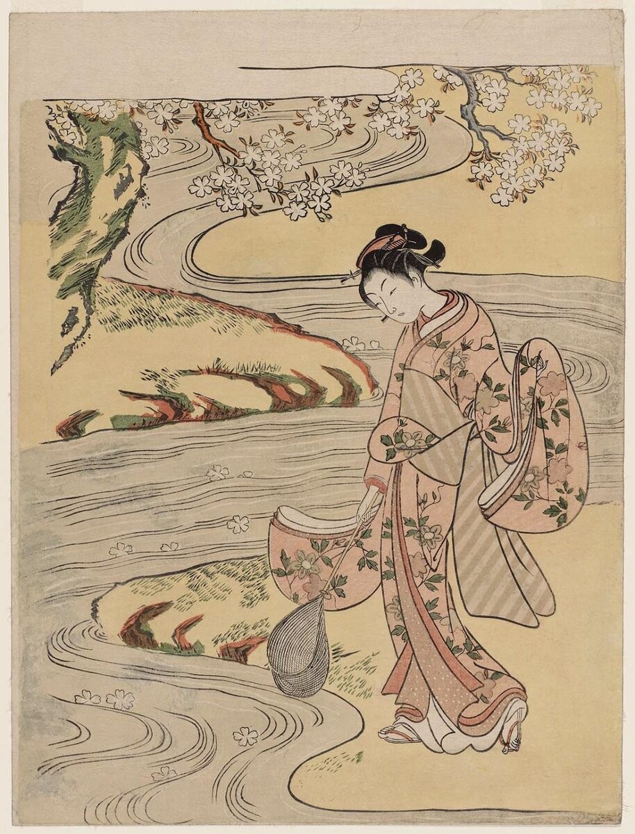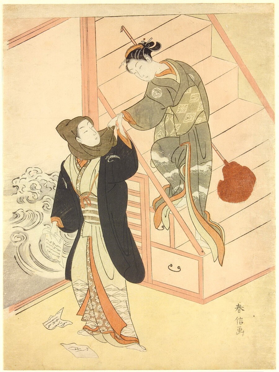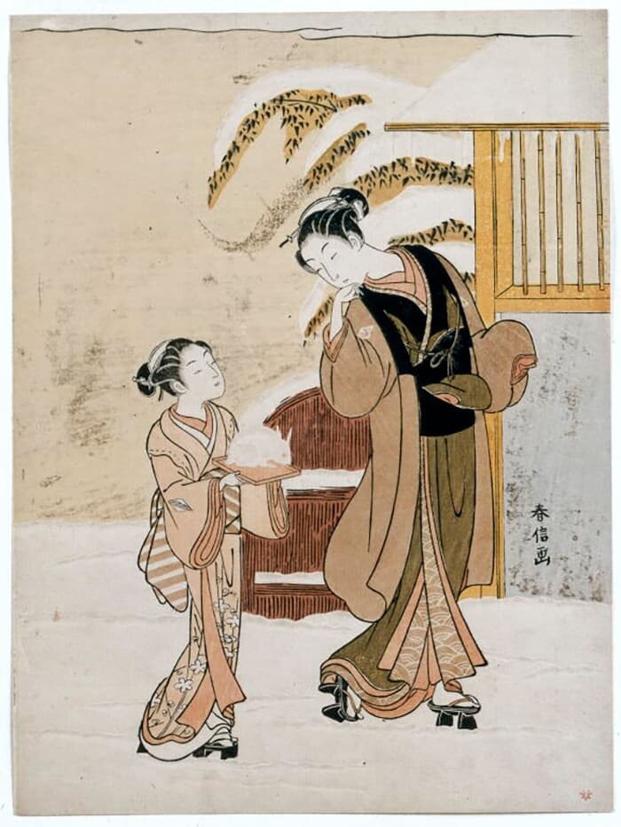 铃木春信(Suzuki Harunobu,1725-1770 年)是日本浮世绘画家,他于 1765 年率先创作了全彩版画。这种版画后来被称为锦绘,即锦缎画。