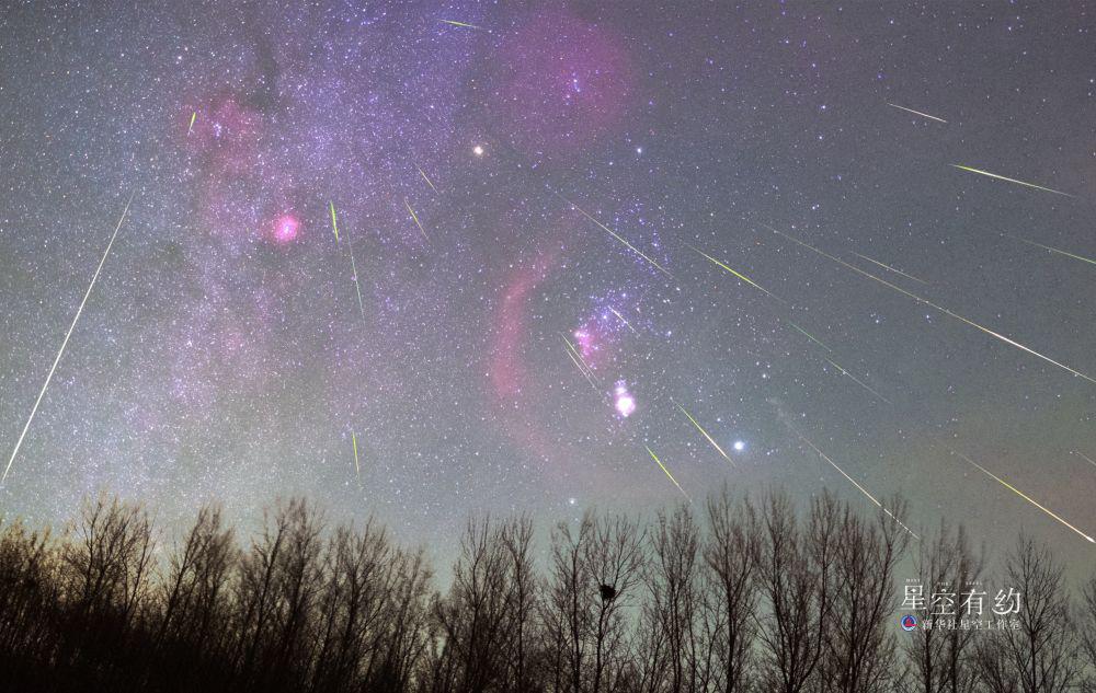 黑龙江省天文摄影爱好者刘成山 2025 年 10 月 21 日在黑龙江金龙山国家森林公园拍制的猎户座流星雨(多张叠加)。(本人供图)