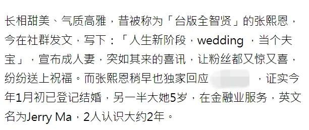 据台湾媒体报道,张熙恩的老公是圈外人,两人相差五岁,男方目前从事金融行业,是很有能力的青年才俊。两人在私下已经谈了两年多的恋爱,期间感情一直很好,据报道两人早在今年一月就已经领证了,只不过现在才公布罢了。