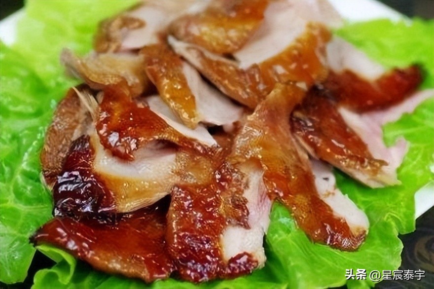北京烤鸭,具有世界声誉的北京名菜,起源于南北朝时期,《食珍录》中已有记录,时属宫廷名菜。用料为优质肉食鸭,果木炭火烤制,色泽红润,肉质肥而不腻,外脆里嫩。