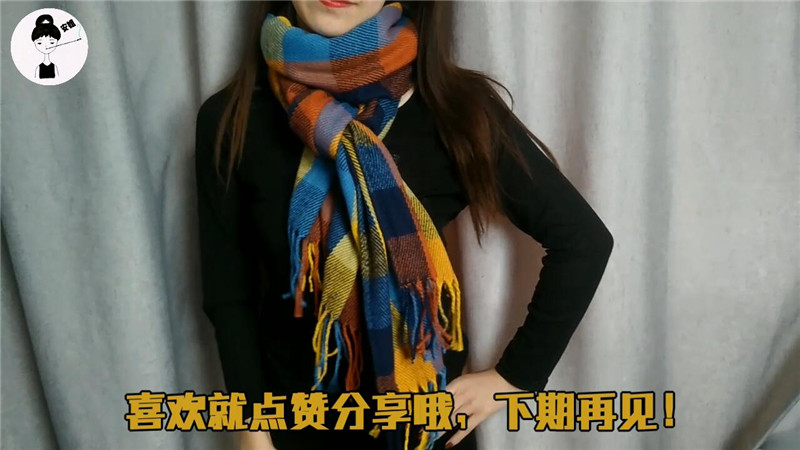 2、围巾对折围在脖子上,将有流苏的一边穿进对折的圈中;