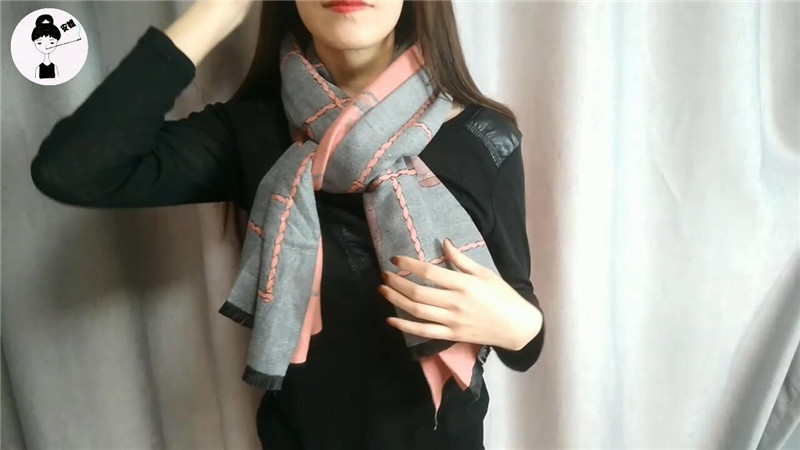 1、将围巾交叉,长的一方倒折从脖子后围过来,再放进倒折后空隙里,